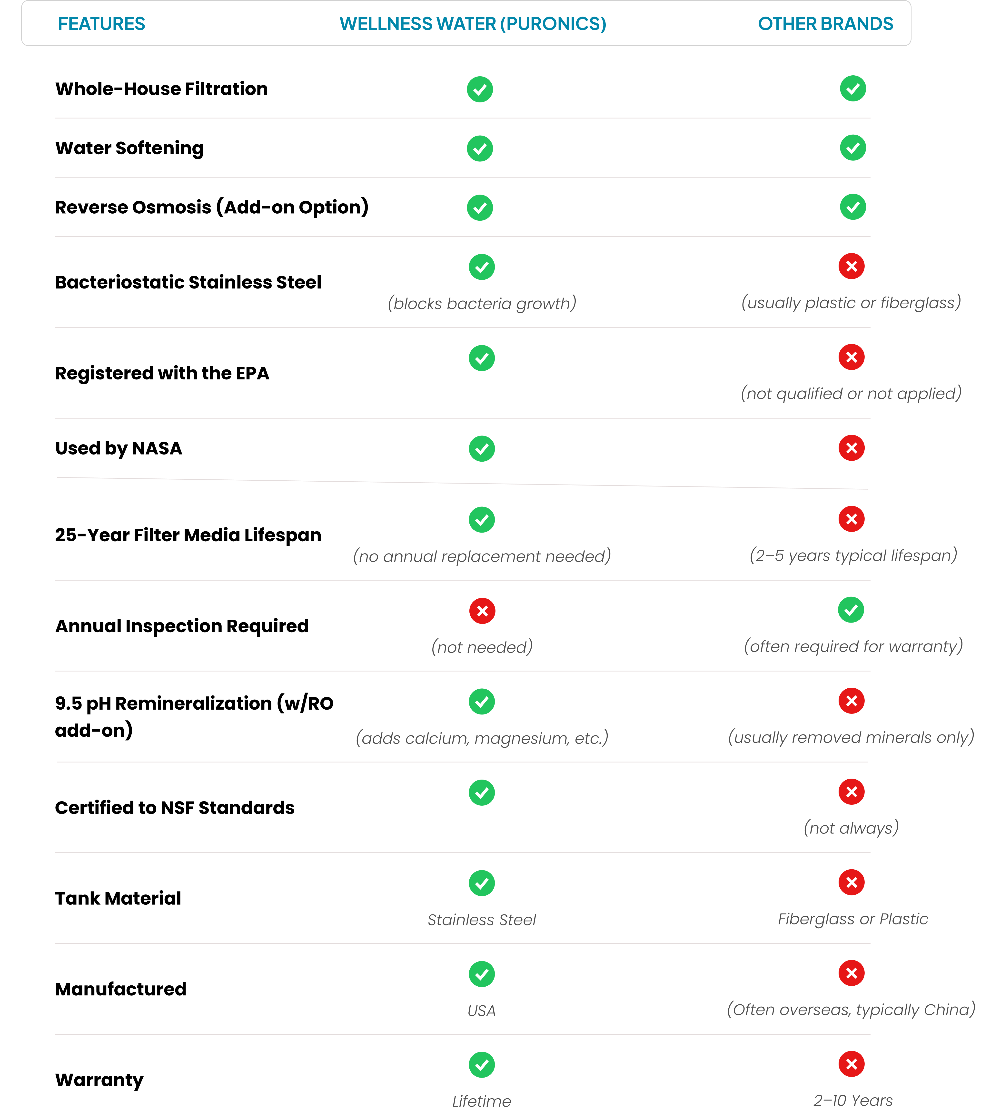 While most systems use basic carbon filters and plastic tanks, Wellness Water by Puronics is engineered with advanced multi-stage filtration technology—built into a stainless steel tank and designed to protect your water, your home, and your health for decades.