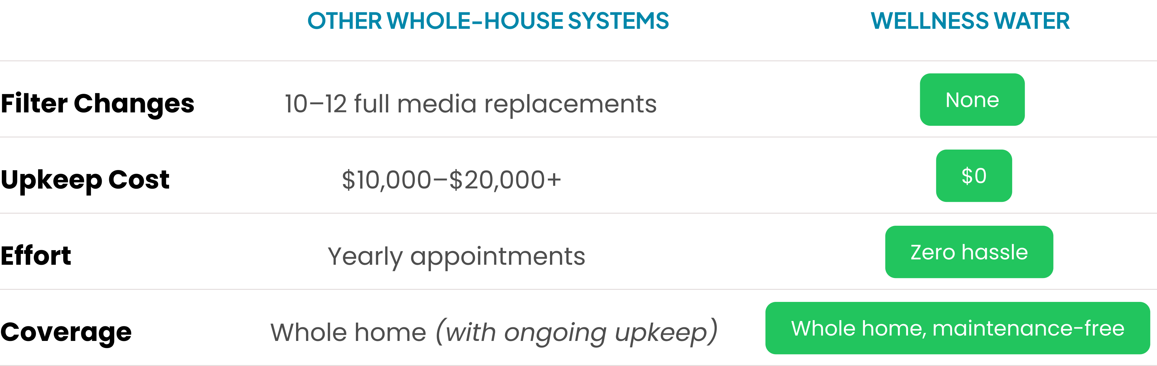 Not with Wellness Water. Our whole-house system uses patented filter media that lasts up to 25 years—no replacements, no maintenance appointments, and no hidden costs.